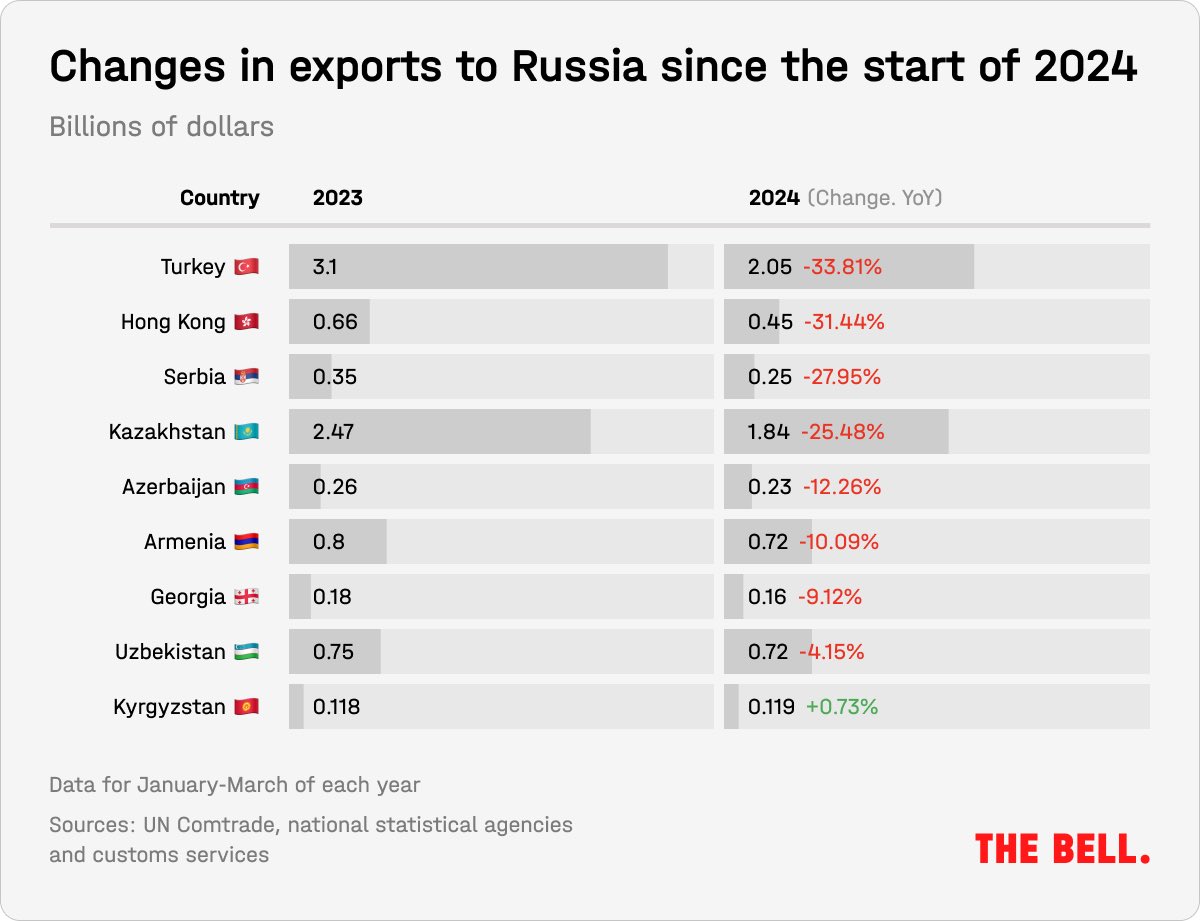 In the first three months of 2024 there was a 57% year-on-year fall in imports of “machinery, equipment, vehicles, instruments and apparatus” from Kazakhstan. There were similar falls from Hong Kong (32%) and Serbia (almost 50%), according to The Bell’s calculations.