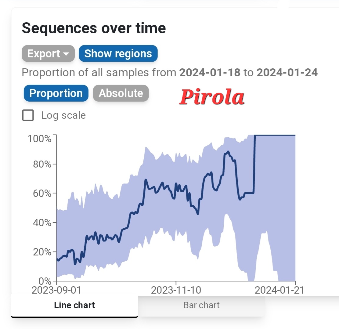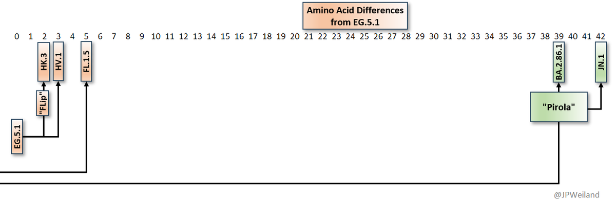 And what is "Pirola"? That's the name I coined for this highly mutated variant. This level of sudden mutation has only happened twice; Omicron, and Pirola. Pirola had even more new mutations than Omicron did when it evolved. A big jump like that definitely deserves a name.