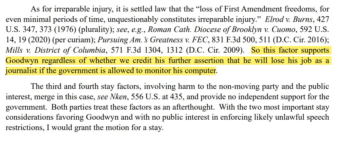 In a dissent, Judge Gregory Katsas (whose opinion in Fischer essentially guided SCOTUS reversal of 1512c2) said he would grant the stay bc Goodwyn is likely to prevail again and Walton's order violates Goodwyn's 1A rights.