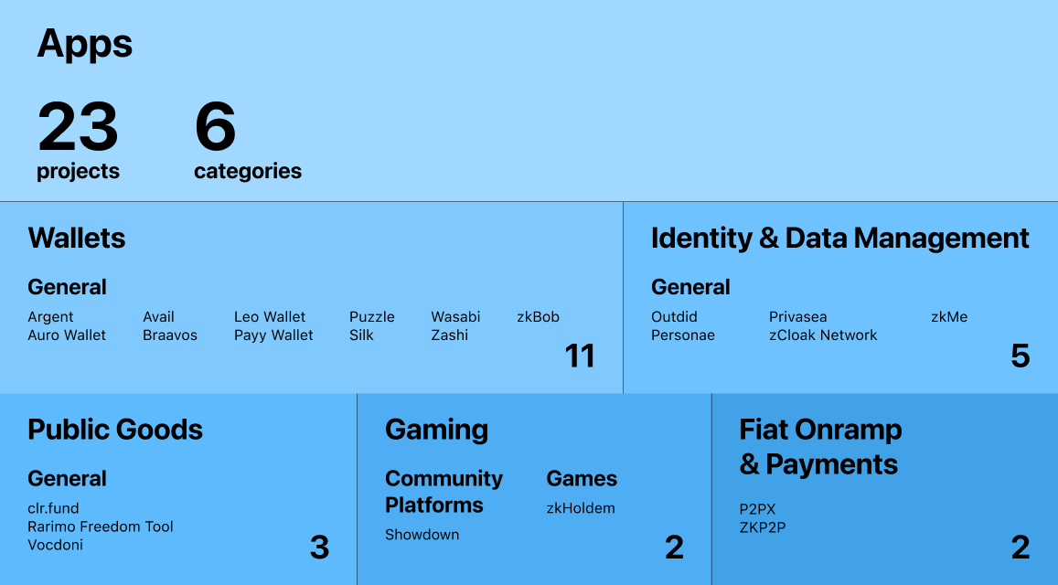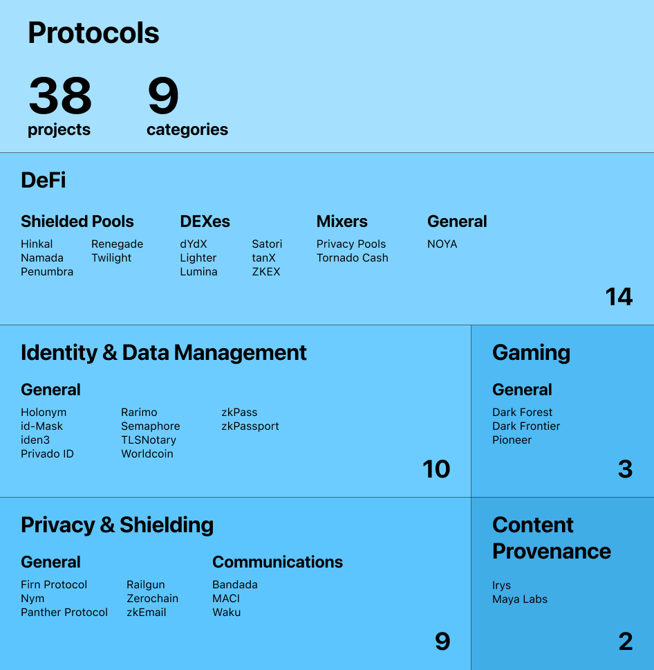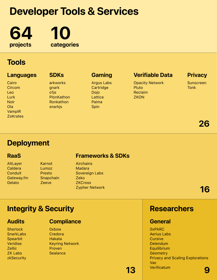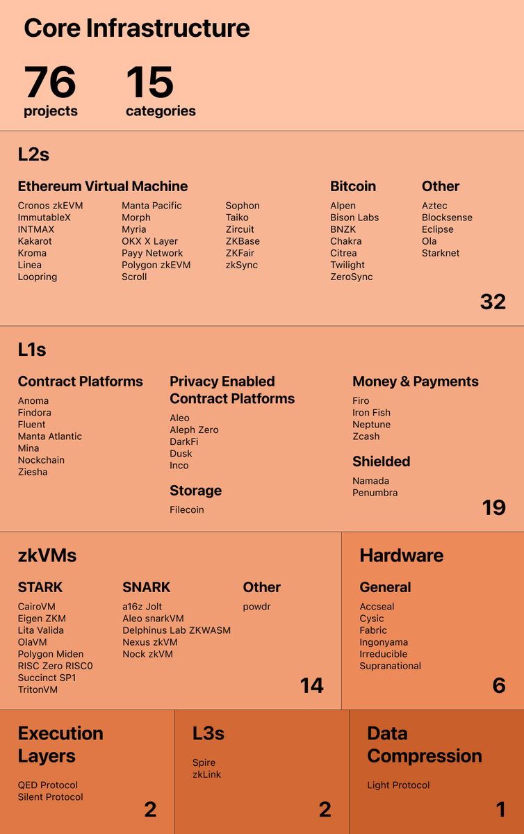 This foundational layer includes projects focused on blockchains, scaling layers, hardware, and virtual machines. These components are essential for building scalable and efficient ZK solutions.