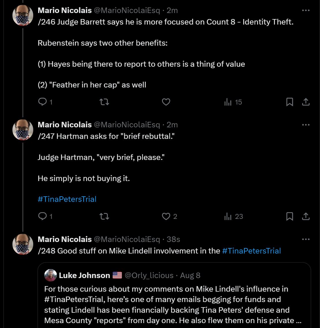 #TinaPetersTrial Check out fantastic coverage from @MarioNicolaiEsq. Before lunch Tina Peters' attorney Dan Hartman performed cross ex of Thornton. It's not every day you witness an attorney guiding a witness to say "WRONG" and "FALSE" so often, but itโs happening here. ๐ฃ