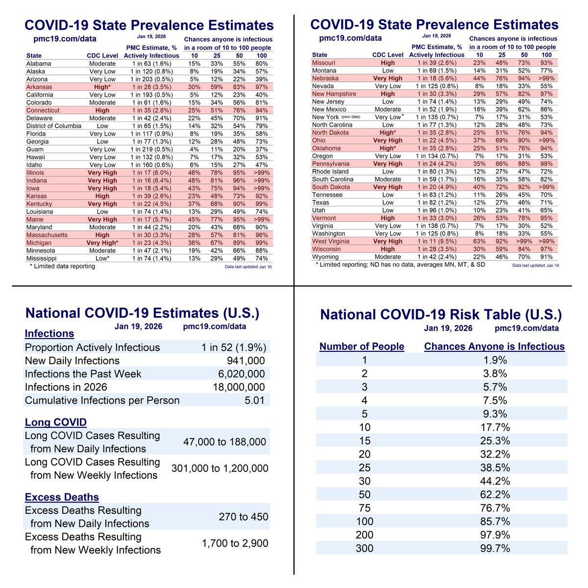 Nationally, we are seeing an estimated 892,000 new daily SARS-CoV-2 infections, meaning a 1 in 4 chance of exposure in a room of 15 people. Risk varies considerably by state.