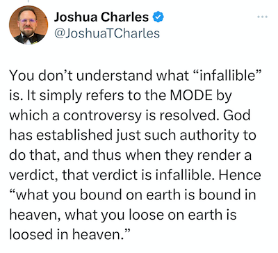 25. Catholics on X will confidently pontificate about this teaching or that, one council or another, one allegedly ex cathedra statement or another, never realizing that their own confusion is because it's they, not Protestants, who "don't understand infallibility"! Now you know.