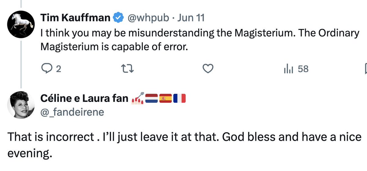 6. This is why both clergy & lay have such a difficult time agreeing on ordinary magisterial infallibility. An online article from The Fatima Organization says "the Ordinary Magisterium is capable of erring," and another here on twitter insists it is not (Exhibits B & C, below).