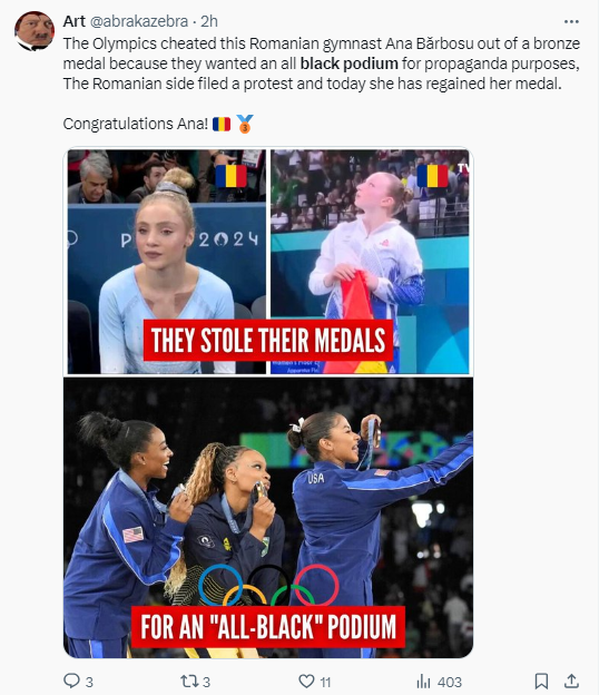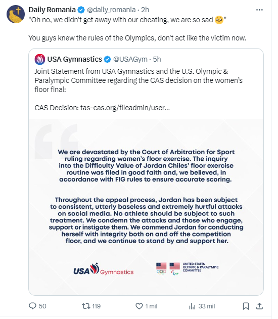 Aqui un ejemplo de como cuentas rumanas siguen empeñados en que USA hizo trampas, que el jurado hizo trampas para conseguir su black podium. LOL Image