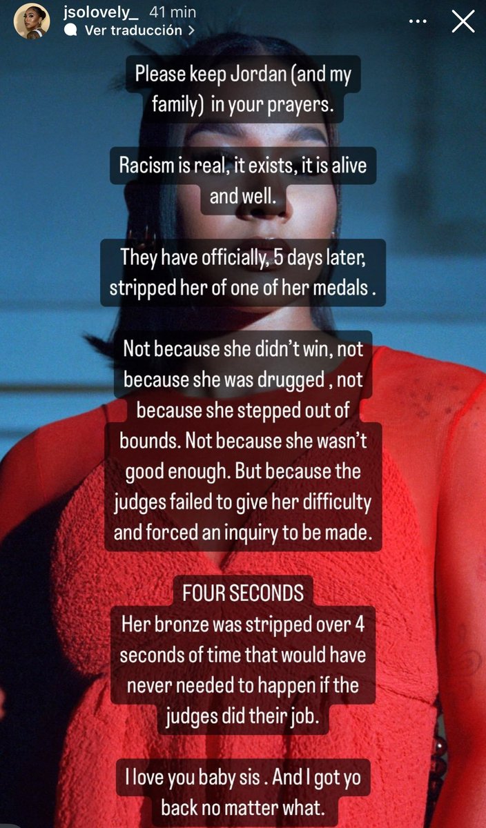 Antes de las declaracion Oficial de la FIG (Fedaración de Gimansia), la hermana de Jordan Chiles nos hace el spoiler en Instragram, "el racismo existe", le han quitado la medalla de bronce a su hermana. Image