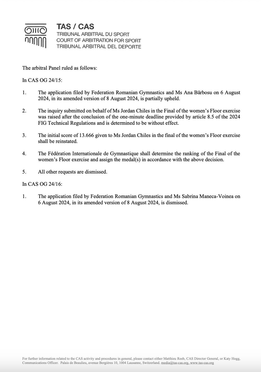 Volvemos a la gimnasia y a la resolución de la investigación. Todo el mundo esperaba que Jordan Chiles mantuviera su medalla de bronce y que a Sabrina Voinea le anulasen la errónea penalización y le entregaran una medalla de bronce, ¿Qué ha pasado?