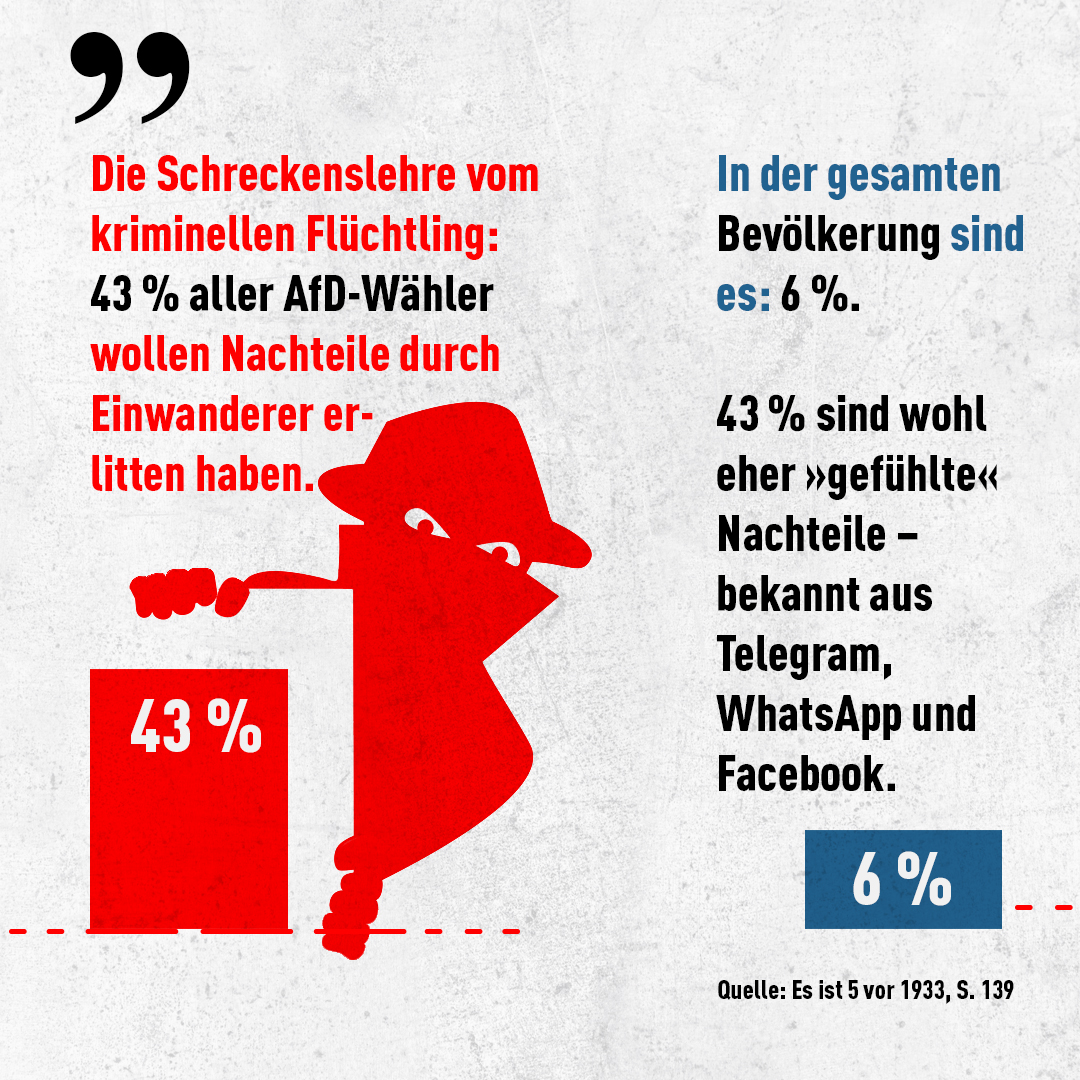 3. Die Schreckenslehre vom kriminellen Flüchtling wirkt inzwischen: 43 % aller AfD-Wähler wollen schon Nachteile durch Einwanderer erlitten haben. In der gesamten Bevölkerung sind es 6 %. Mit anderen Worten: bei den 43 % der AfD-Wähler sind es wohl eher "gefühlte" Nachteile.