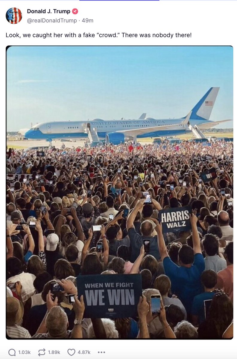 Donald Trump falsely claims on Truth Social that Kamala Harris' campaign "faked" the size of her crowd at Detroit Metropolitan Airport, saying that "there was nobody there".