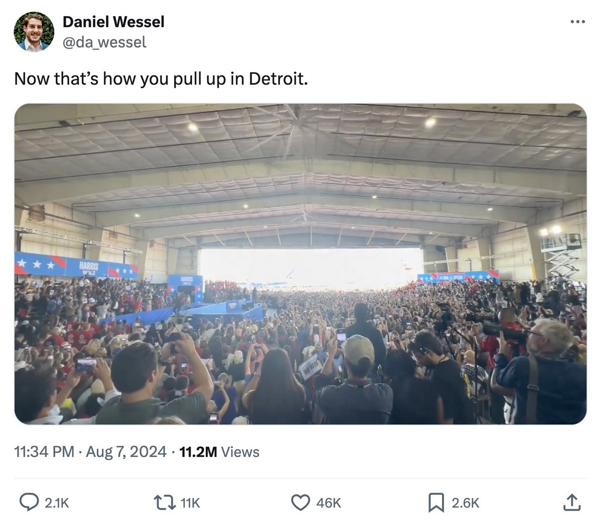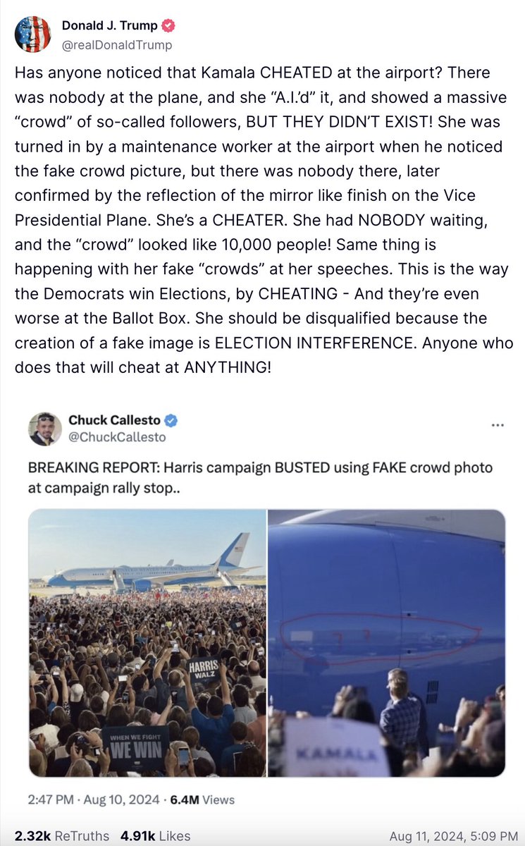 Referencing a series of viral but totally false claims by his supporters, Trump is suggesting that the Harris campaign used AI to make her crowd at Detriot Metropolitan Airport appear larger.