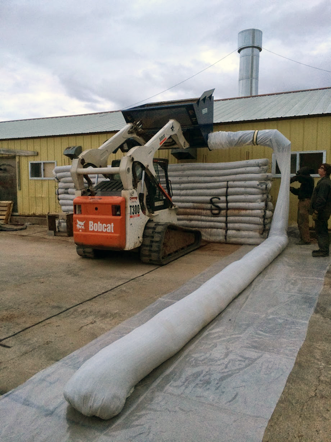 In some construction methods, continuous tube earth bags are used such as seen below, less used in a military context where gabions such as Hesco Bastion or JS Franklin DefenceCell is more common