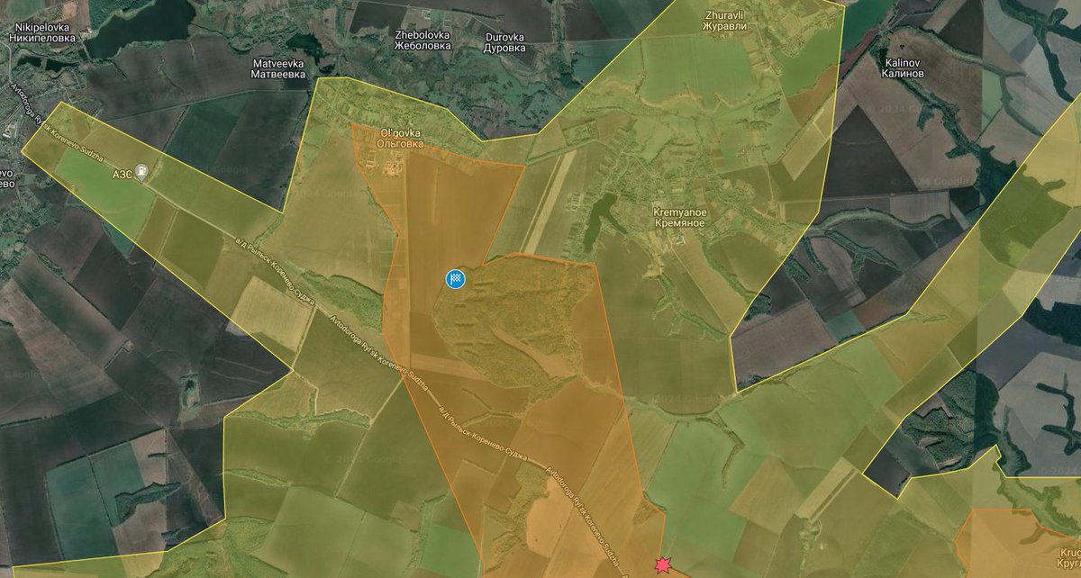 Russian strike on Ukrainian positions south of Olgovka and southwest of Kremyanoe. Multiple Russians claim that in the last 48 hours, Olgovka occupied and fighting in/near Kremyanoe and near Korenevo. Expanded Ukrainian occupied from Zelenyi Shlyakh.