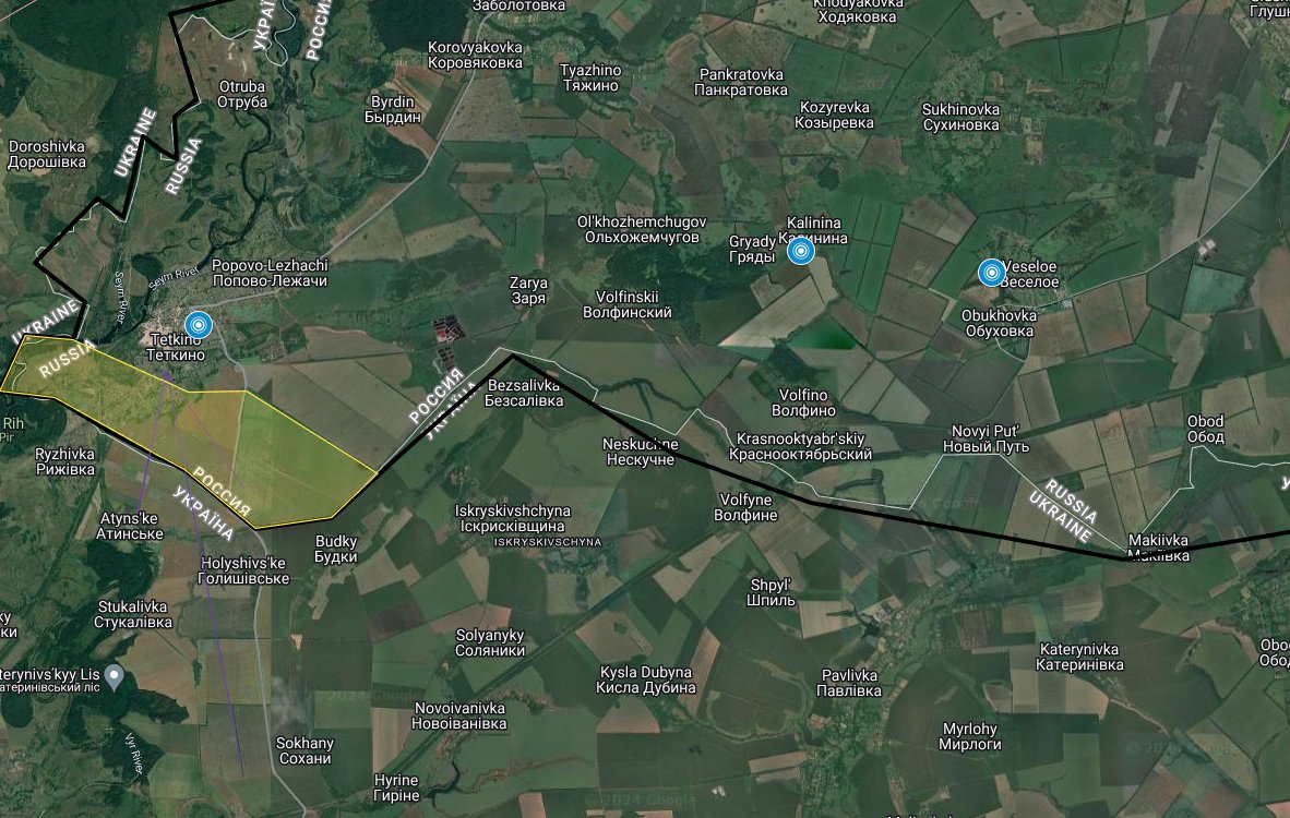 Is Ukraine setting conditions near Tetkino? A Russian 2S43 Malva 152mm self-propelled howitzer was destroyed near Kalinina, and a Russian military truck was destroyed in Vesseloe. This is in addition to the 10 August 2024 reports of communications knocked out.