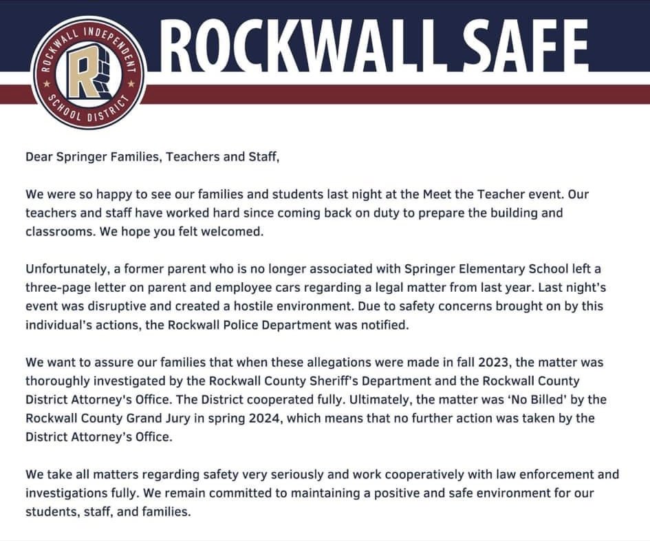 They are choosing to escalate a situation that could have used that attention months ago. Like Rockwall ISD stated, our family lives by the fact that students safety is our utmost concern. Hence the information that was disseminated yesterday. While the district attorneyโs office did issue a โno billโ that doesnโt mean there wasnโt evidence, in fact rather than dismissing the case, it has been left with the option to retry her when and if more evidence comes to light.
