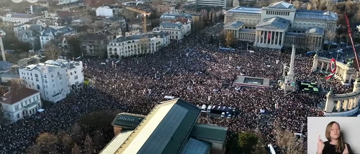 Des centaines de milliers de hongrois "anti-guerre", pro-Orban, anti-UE/Zelenski rassemblés devant le Parlement de Budapest.