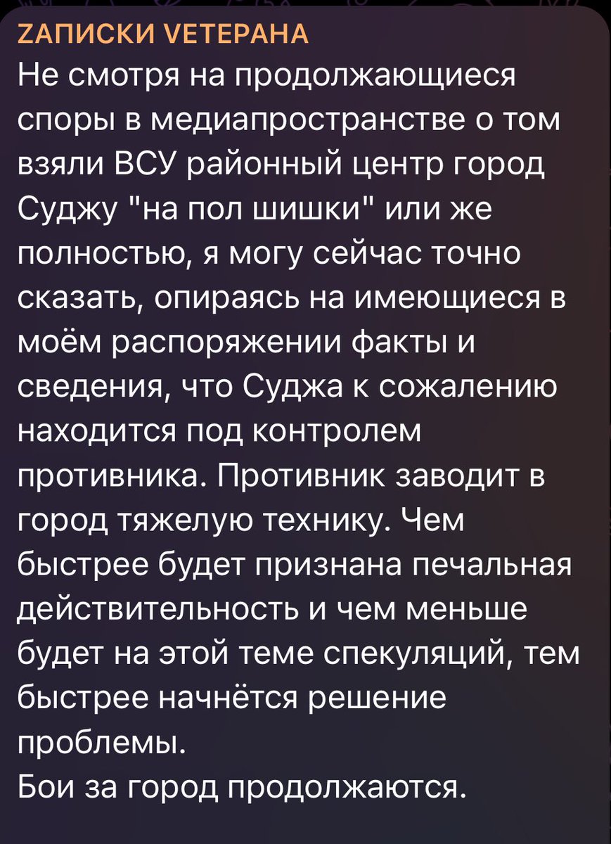 “Despite the ongoing debate in the media about whether the Ukrainian Armed Forces took the regional center of Sudzha "half-heartedly" or completely, I can now say for sure, based on the facts and information at my disposal, that Sudzha is unfortunately under enemy control.”