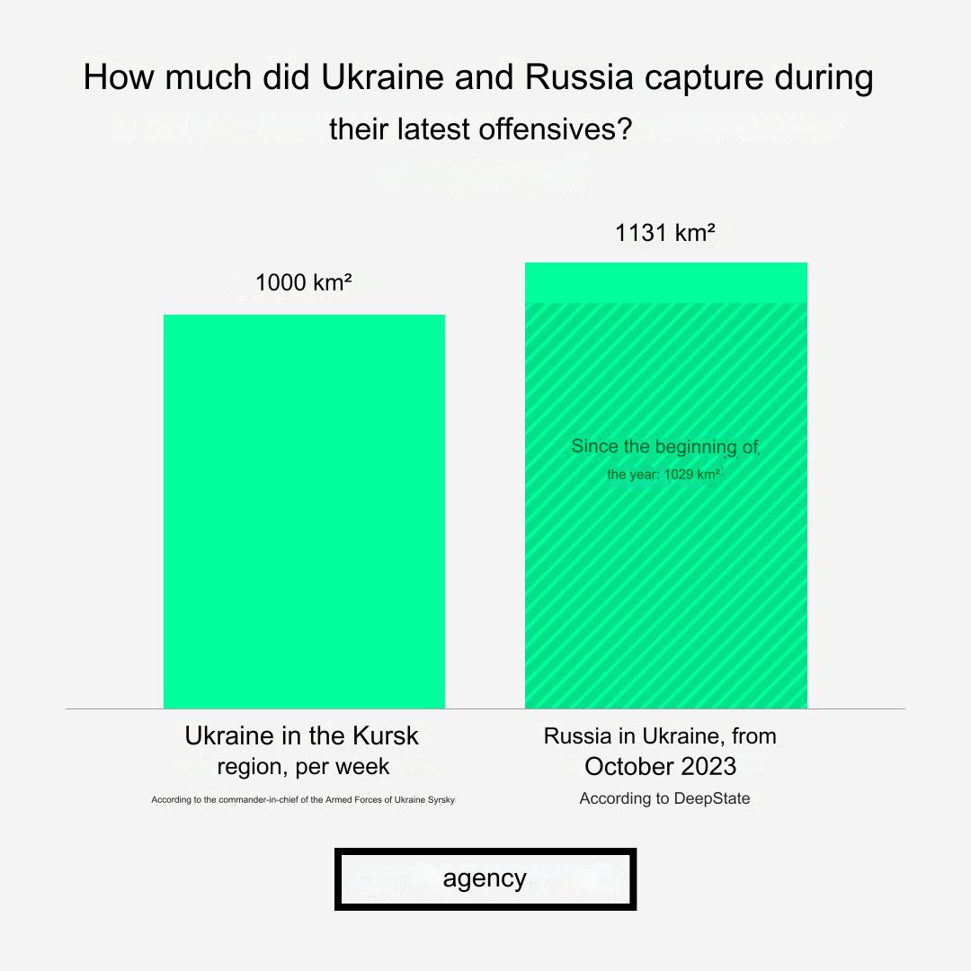 of 1,000 sq. km. Most likely, these are also slightly more optimistic figures. If Syrskyi's words are true, the territory captured by Ukraine in a week is comparable to what Russia has captured since the beginning of the year and only 131 sq. km less than Russia has captured