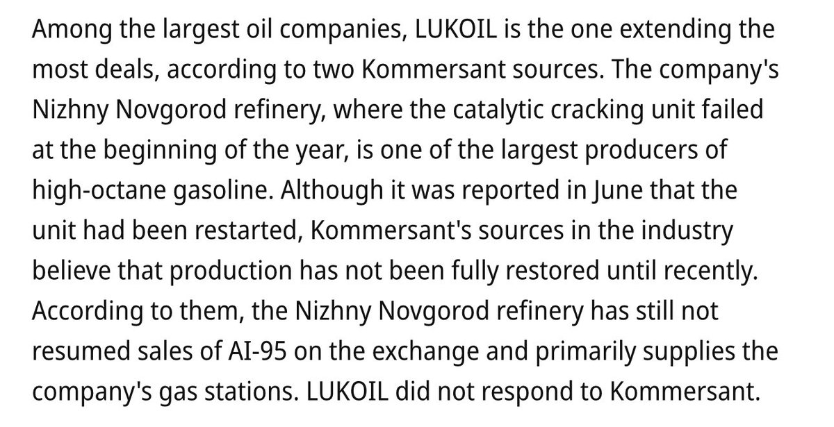 “According to them, the Nizhny Novgorod refinery has still not resumed sales of AI-95 on the exchange and primarily supplies the company's gas stations. LUKOIL did not respond to Kommersant.”
