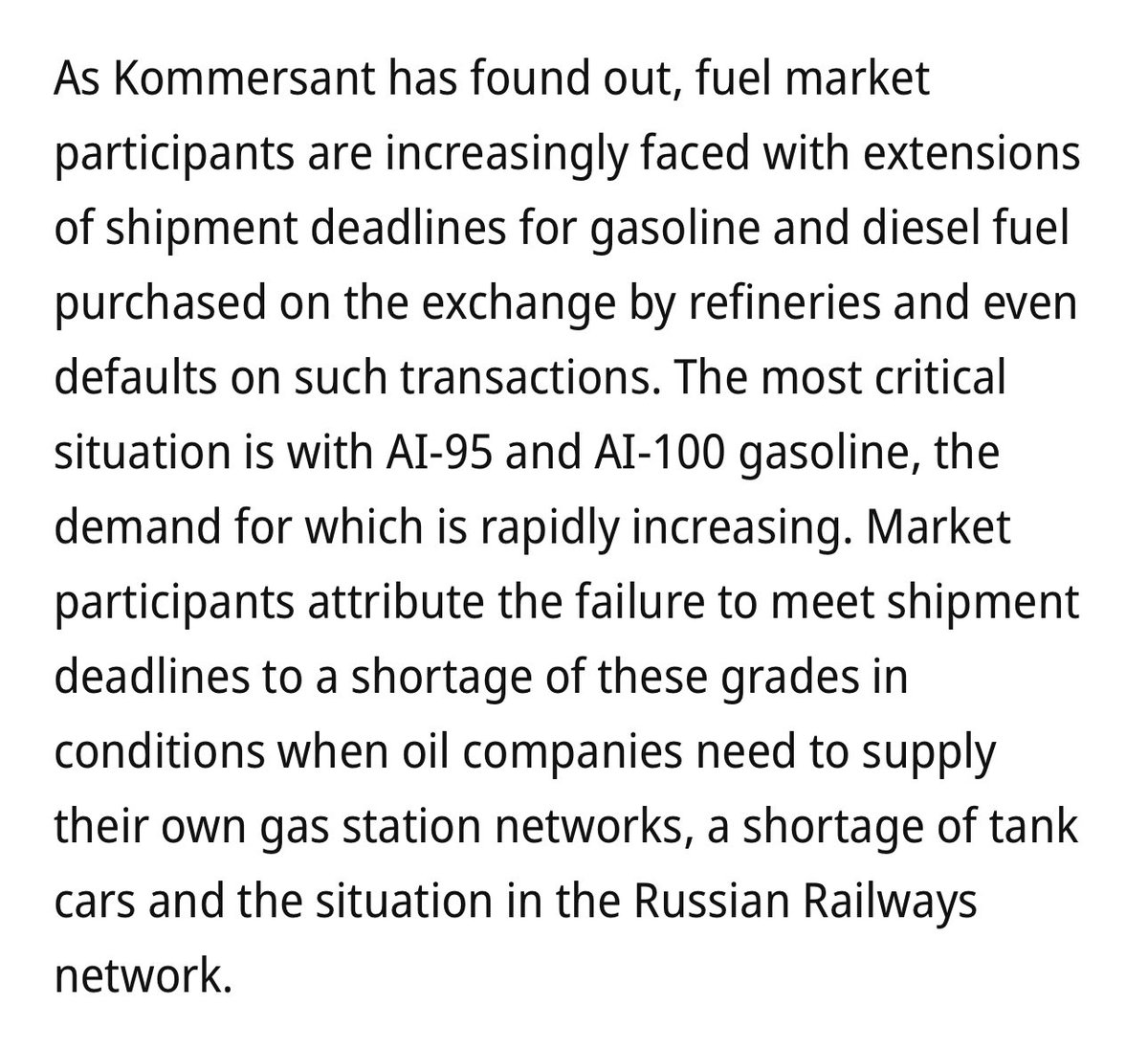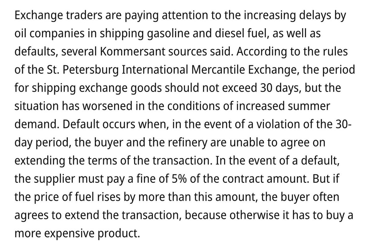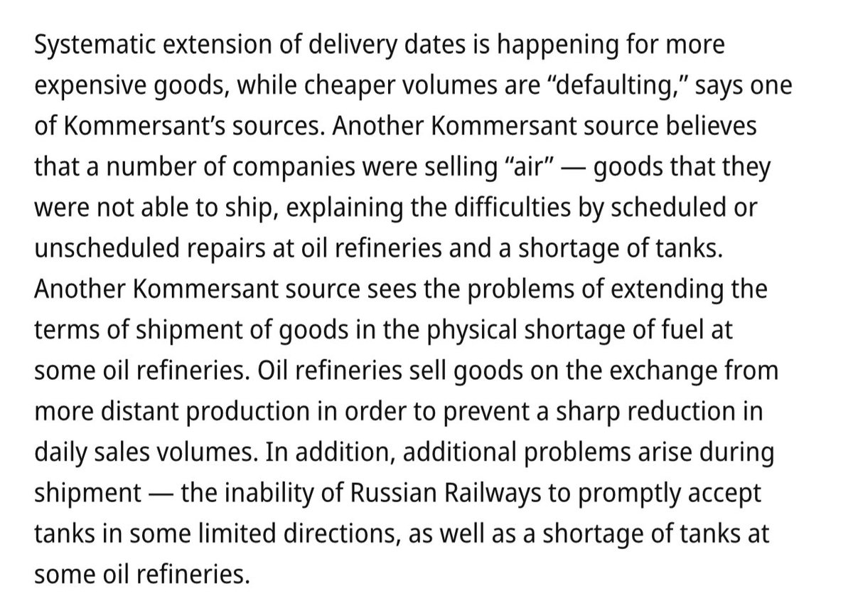 “Another Kommersant source sees the problems of extending the terms of shipment of goods in the physical shortage of fuel at some oil refineries. Oil refineries sell goods on the exchange from more distant production in order to prevent a sharp reduction in daily sales volumes.”