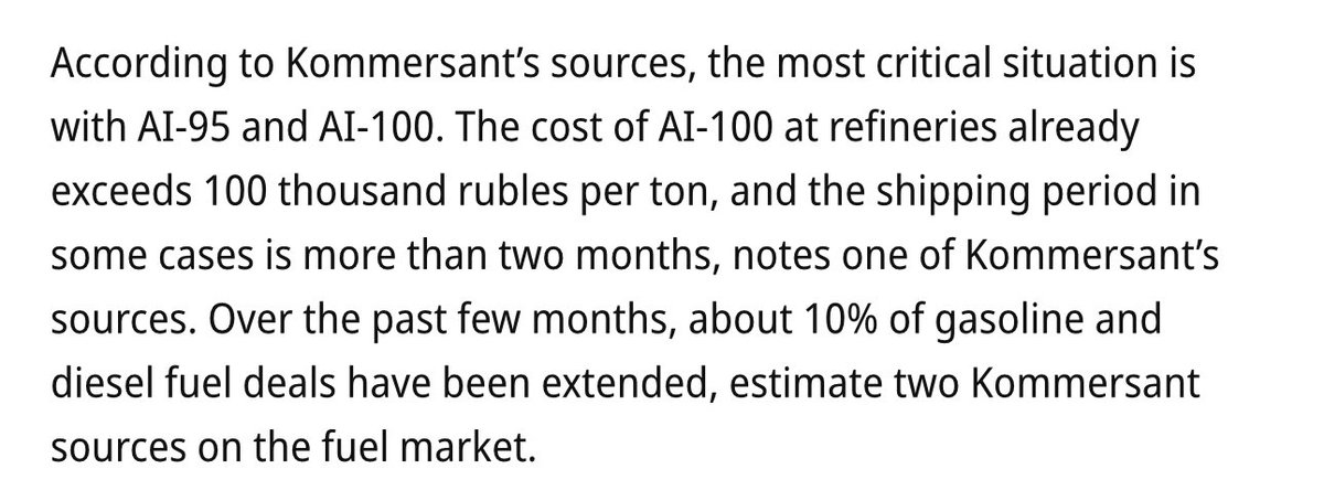 “the most critical situation is with AI-95 and AI-100. The cost of AI-100 at refineries already exceeds 100 thousand rubles per ton, and the shipping period in some cases is more than two months, notes one of Kommersant’s sources.”
