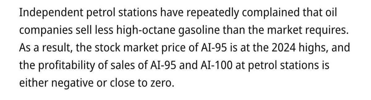 “As a result, the stock market price of AI-95 is at the 2024 highs, and the profitability of sales of AI-95 and AI-100 at petrol stations is either negative or close to zero.”