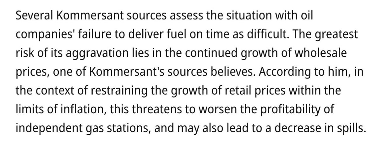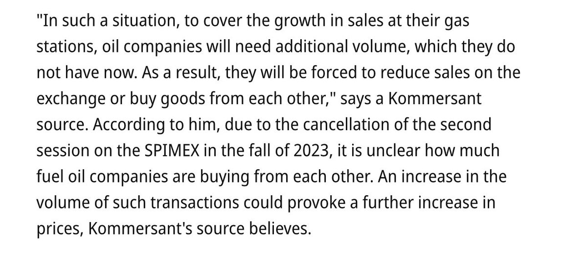 “"In such a situation, to cover the growth in sales at their gas stations, oil companies will need additional volume, which they do not have now. As a result, they will be forced to reduce sales on the exchange or buy goods from each other," says a Kommersant source.”