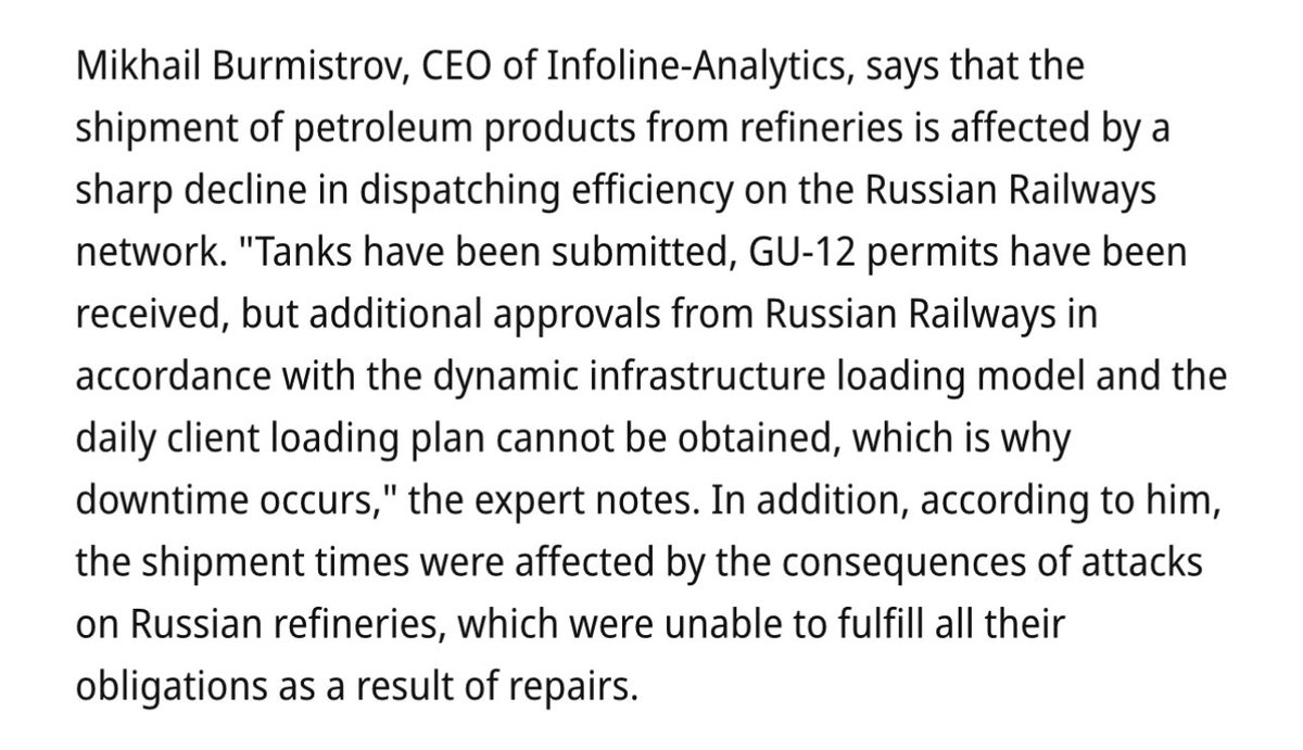 ‼️“Mikhail Burmistrov, CEO of Infoline-Analytics, says that the shipment of petroleum products from refineries is affected by a sharp decline in dispatching efficiency on the Russian Railways network.”