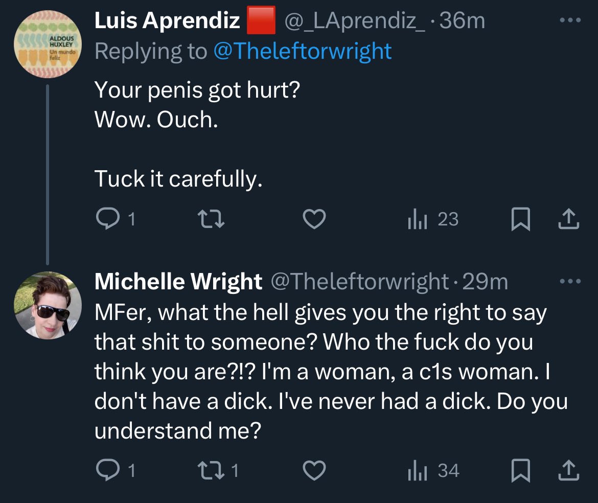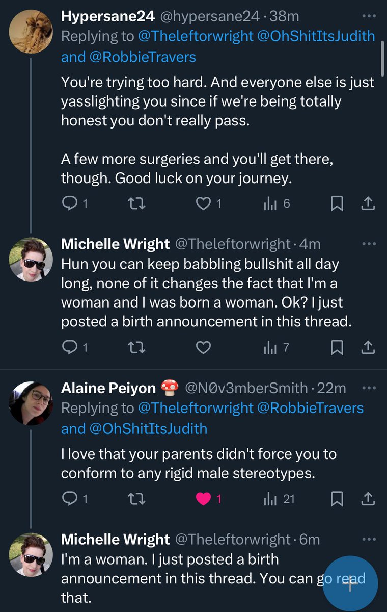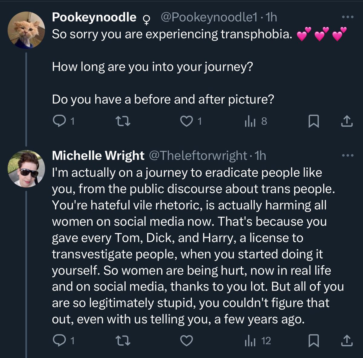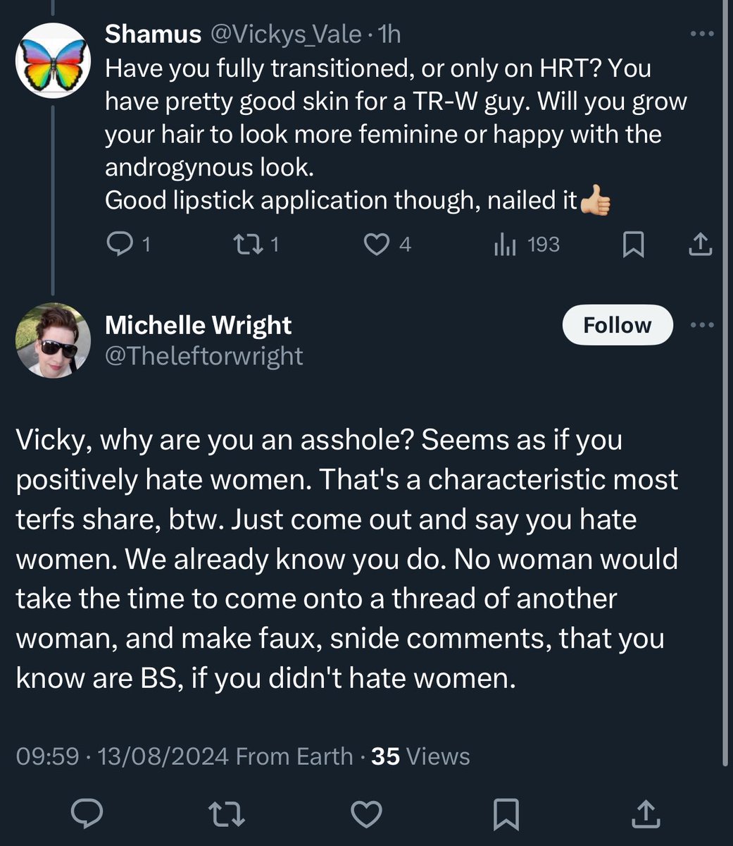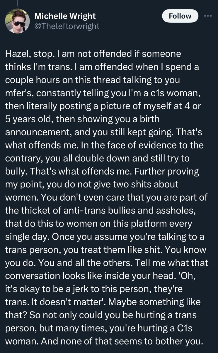April was VERY upset. He said that these women ‘masquerading as tr&ns women’ for profit was ‘disgusting’. He even went as far as comparing it to blackface! Well, I think that April would be very shocked to find out that women have been comparing men wearing dresses to blackface for a long time. But don’t let us get in the way of that complete lack of self awareness, ‘April’.
