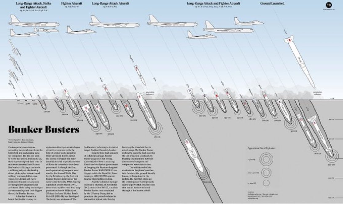 Même la bombe GBU-57 des États-Unis, conçue spécialement pour un scénario catastrophe, ne peut pénétrer que jusqu’à 60 mètres de profondeur avant d’exploser.