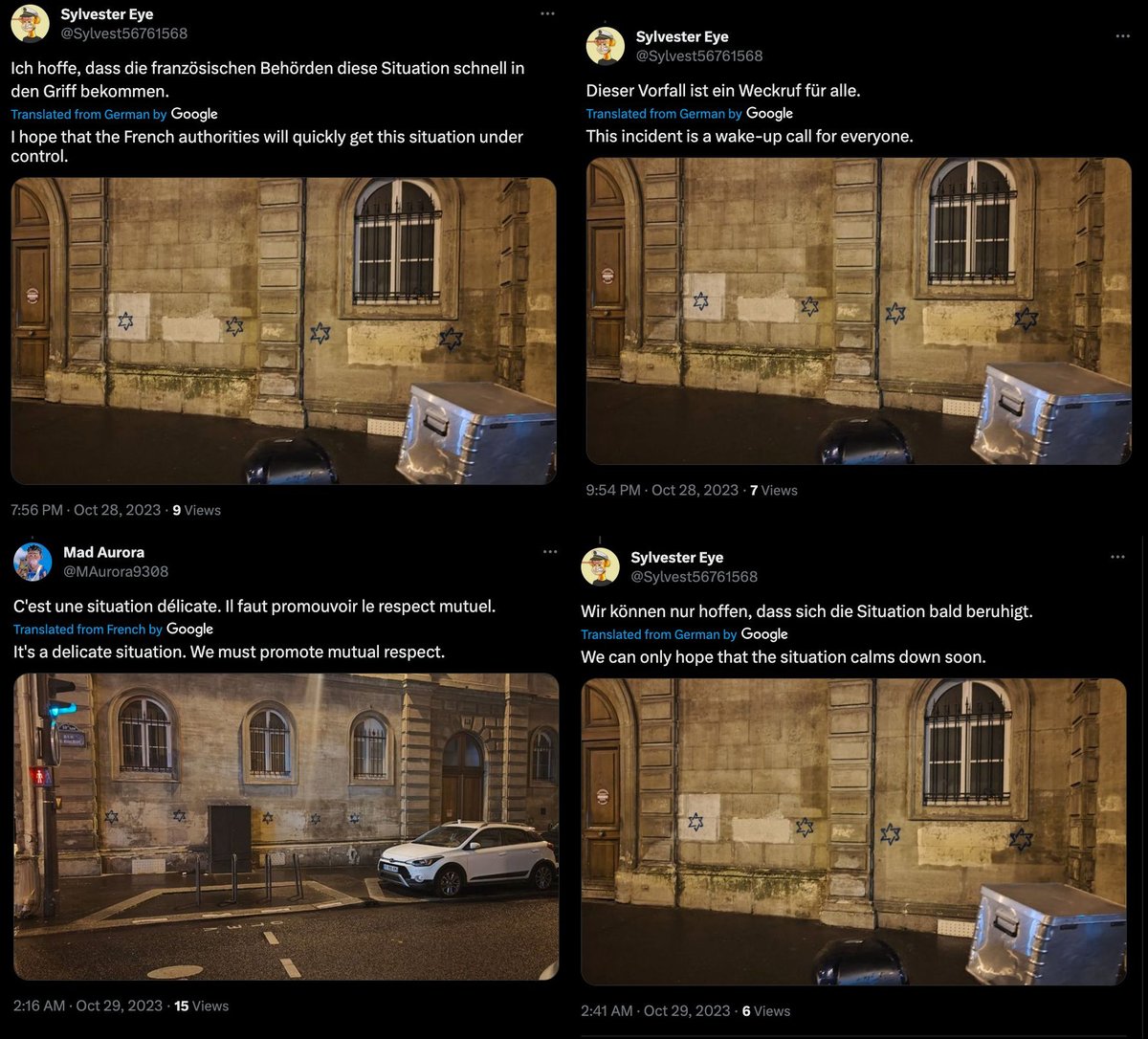 Oct 28/29 night: pro-Kremlin Doppelganger bots are tweeting unique(!) photos of ✡️, expressing "deepest concerns" about them in French, English and German