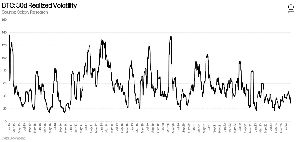 In prior bear markets, such as in 2012, 2015-2016, and 2019, BTCUSD traded lower than -80% from its prior all-time highs. March 2020 and late 2022/early 2023 saw Bitcoin drop to -75% of its prior all-time high. Despite Bitcoin’s meteoric rise over the past 15 years, bear markets have historically been severe.