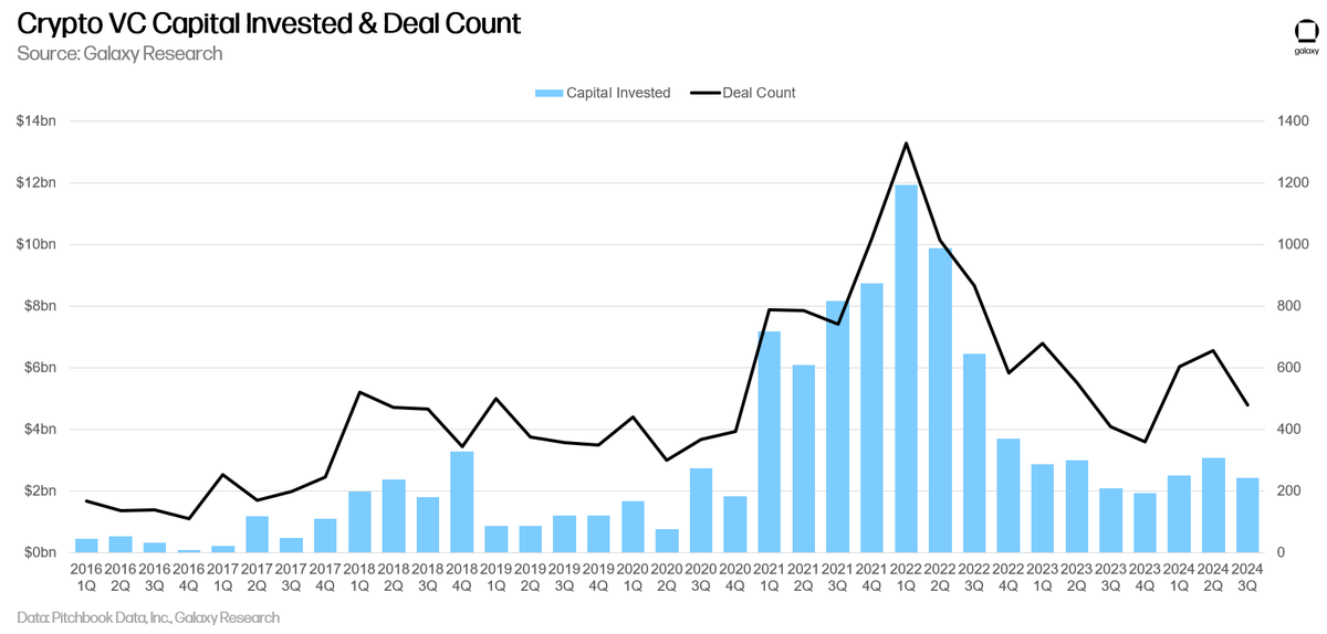 on the deal side, crypto VC fund activity ticked down QoQ, with VCs investing $2.4bn across 487 deals. a tepid environment to say the least
