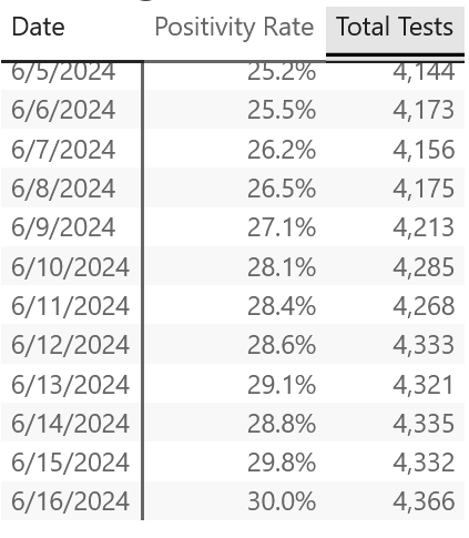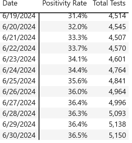 A new summer testing high was reached with 11.2k tests done, and testing is still trending higher. This is the highest testing rate during summer since 2022! Data shows the latest positivity rate of 39.4% as of August 8.