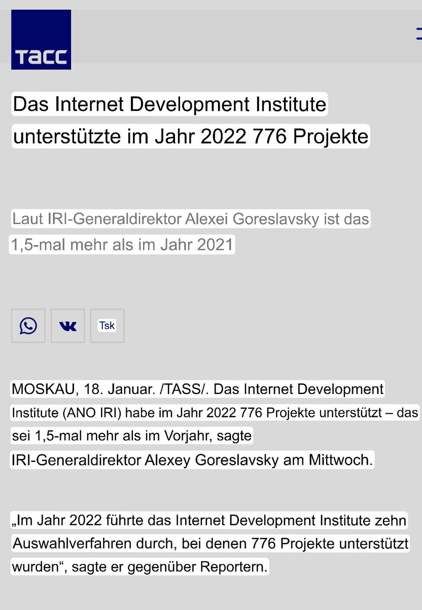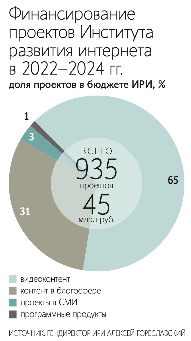 Das Institut für Internetentwicklung «ИРИ», das der russischen Präsidialverwaltung untersteht, hat im Jahr 2023 allein für die Erstellung "patriotischer Inhalte" 20 Milliarden Rubel an Zuschüssen verteilt.