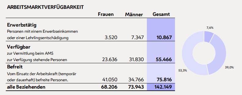 Wieviele beträfe das? Per Juli 2024 wären es exakt 55.466 Personen von insgesamt 142.149 BezieherInnen. Alle anderen? Alle anderen sind entweder bereits berufstätig (10.867) und müssen aufstocken oder sind nicht arbeitsfähig (75.816) v.a. weil es Kinder sind.