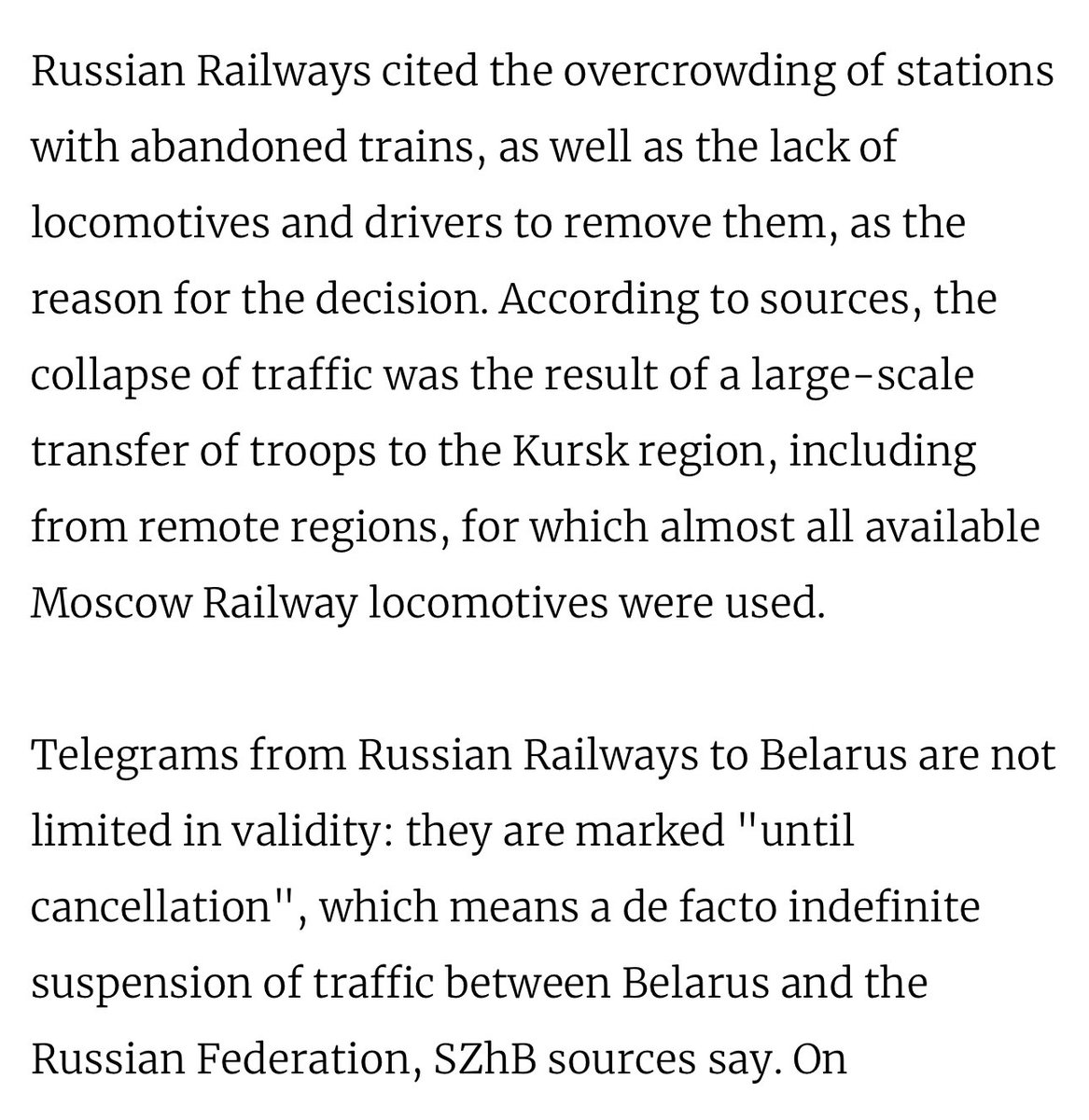 ‼️ “Russian Railways have faced a transport collapse in regions bordering Ukraine and Belarus following the Ukrainian Armed Forces' invasion” of Kursk”