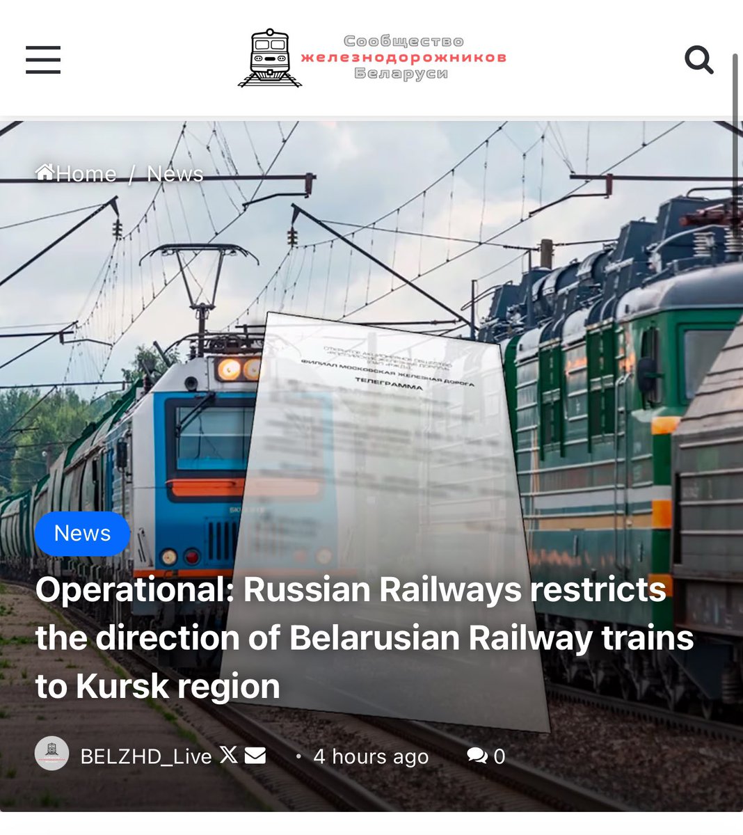 “Due to difficulties with train traffic, Russian Railways has stopped accepting trains from Belarus in the direction of the Kursk and Smolensk regions, the Belarusian Railway Workers' Community (BRC) reports”