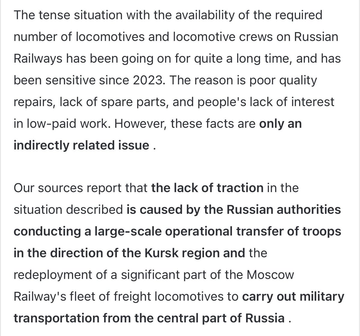 “According to sources, the collapse of traffic was the result of a large-scale transfer of troops to the Kursk region, including from remote regions, for which almost all available Moscow Railway locomotives were used.”