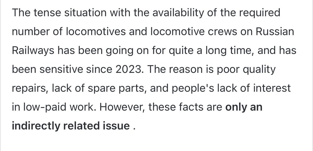 “The tense situation with the availability of the required number of locomotives and locomotive crews on Russian Railways has been going on for quite a long time, and has been sensitive since 2023.”