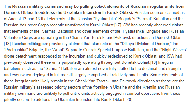 The Russian military command may be pulling select elements of Russian irregular units from Donetsk Oblast to address the Ukrainian incursion in Kursk Oblast.⬇️🧵(1/5)