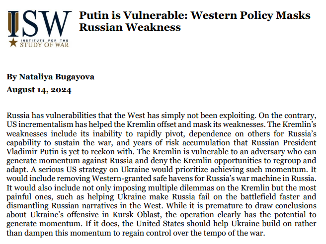 NEW: Ukraine’s offensive in Kursk has the potential to generate momentum for Ukraine, argues @nataliabugayova. If it does, the US can help Ukraine build on rather than dampen that momentum to regain control over the tempo of the war by targeting Russia's unexploited weaknesses.🧵