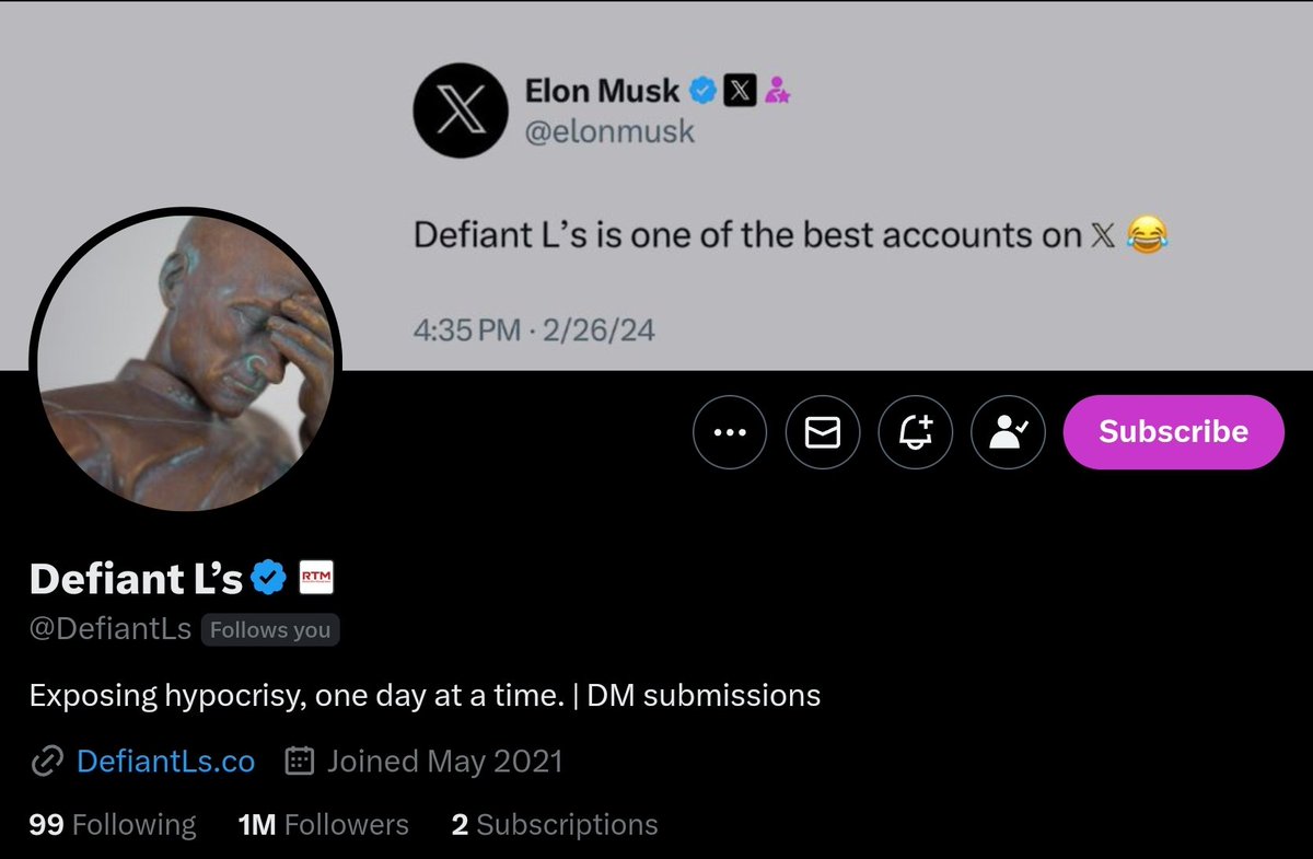 #4 Defiant L's (@DefiantLs) they say a picture speaks a thousand words, and this is true in the L's the are captured by this account in image form. @elonmusk himself says he's one of the best accounts on 𝕏. Make sure to give him a follow.