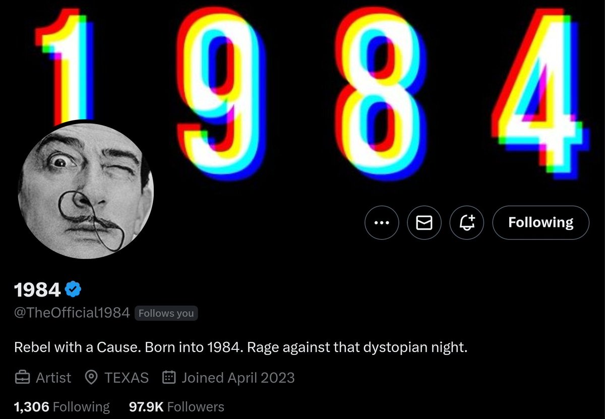 #8 1984 @TheOfficial1984 for a dystopian future that is happening now, follow this rebel with a cause (he also made the graphic at the beginning of this thread).