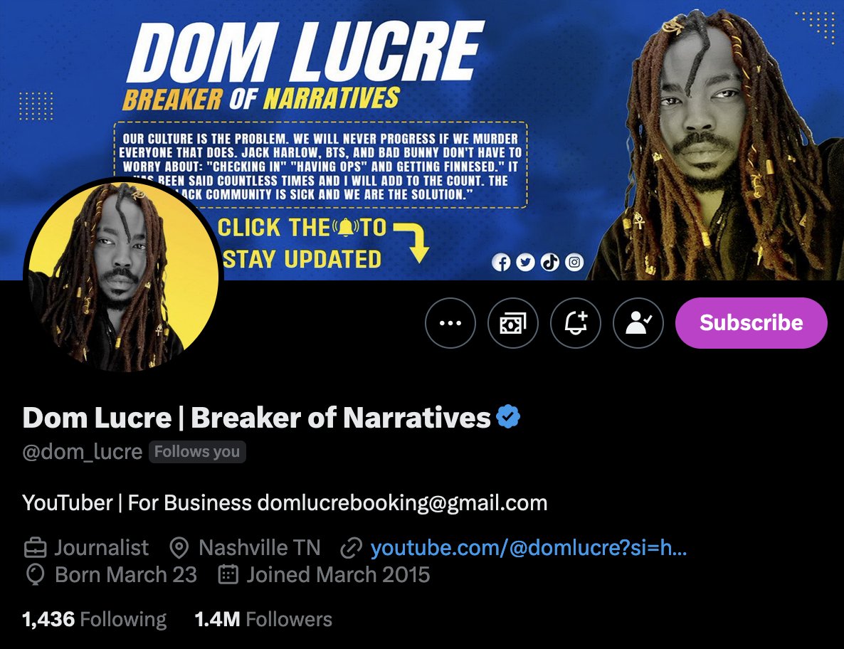 #10 Dom Lucre (@dom_lucre) uses his platform to call out hypocrisy by holding a mirror up to the woke cult. Give him a follow for breaking stories and political hot takes.