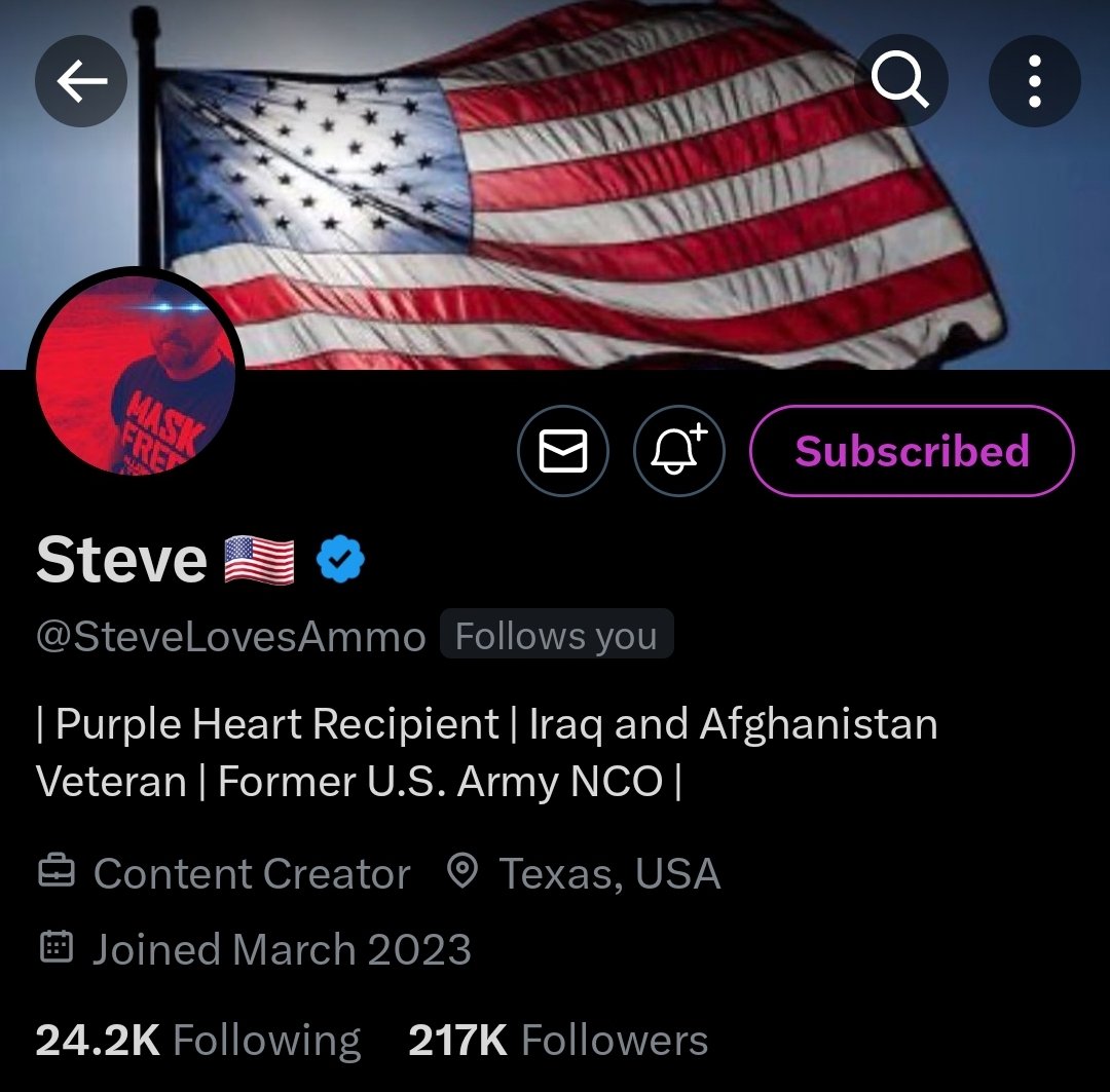 #17 Steve (@SteveLovesAmmo) has a huge heart for people & has been through it all as a Veteran who served in Afghanistan & Iraq. He is a vocal critic of both the military and medical industrial complex. He's someone I personally subscribe to as a thank you for his service. ❤️🇺🇲
