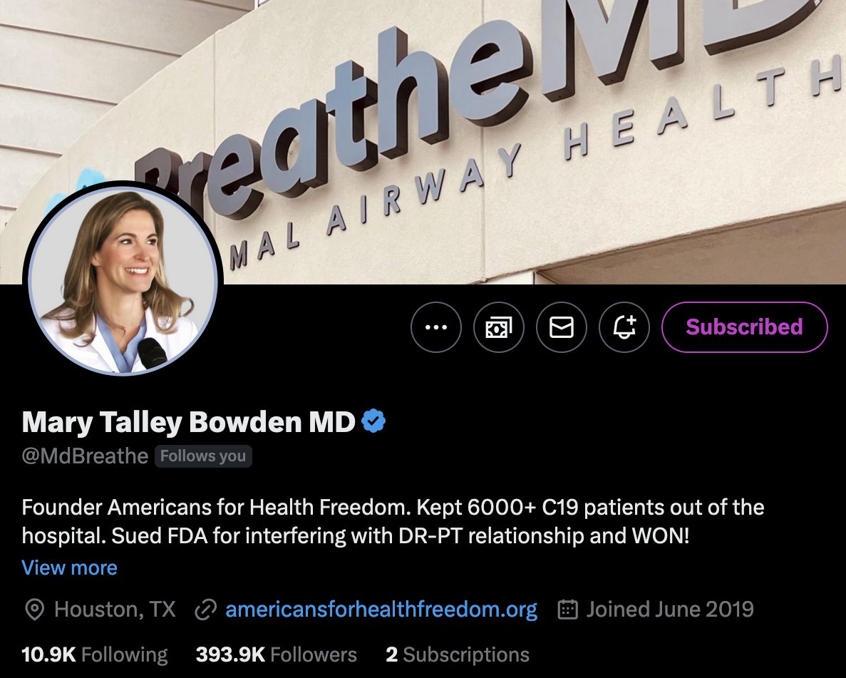 #23 Mary Bowden (@MdBreathe) is an MD from Houston and the founder of Americans for Health Freedom. She is an asset to your timeline.