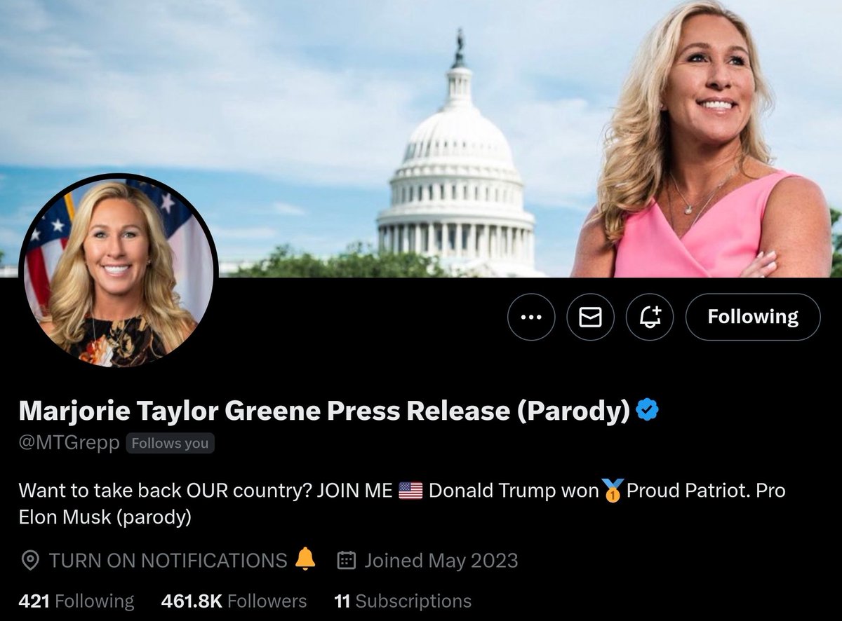 @MdBreathe @MattWallace888 @nicksortor @KimDotcom @OneBadDude_ Marjorie Taylor Greene Press Parody (@MTGrepp) where sarcasm and MAGA loyalty collide to create a political fierce Parody that keeps us on our toes and shares breaking information with their own take. Make sure to follow and turn on notifications to be first in the comments. 🔔