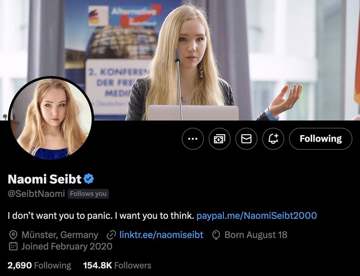 @MdBreathe @MattWallace888 @nicksortor @KimDotcom @OneBadDude_ @MTGrepp @iAnonPatriot @zerohedge Naomi Seibt (@SeibtNaomi) is a German activist known for her strong stance against climate change alarmism and her criticism of the "woke" society. Despite facing backlash and attempts to silence her, Naomi remains steadfast in her beliefs and continues to voice her opinions.