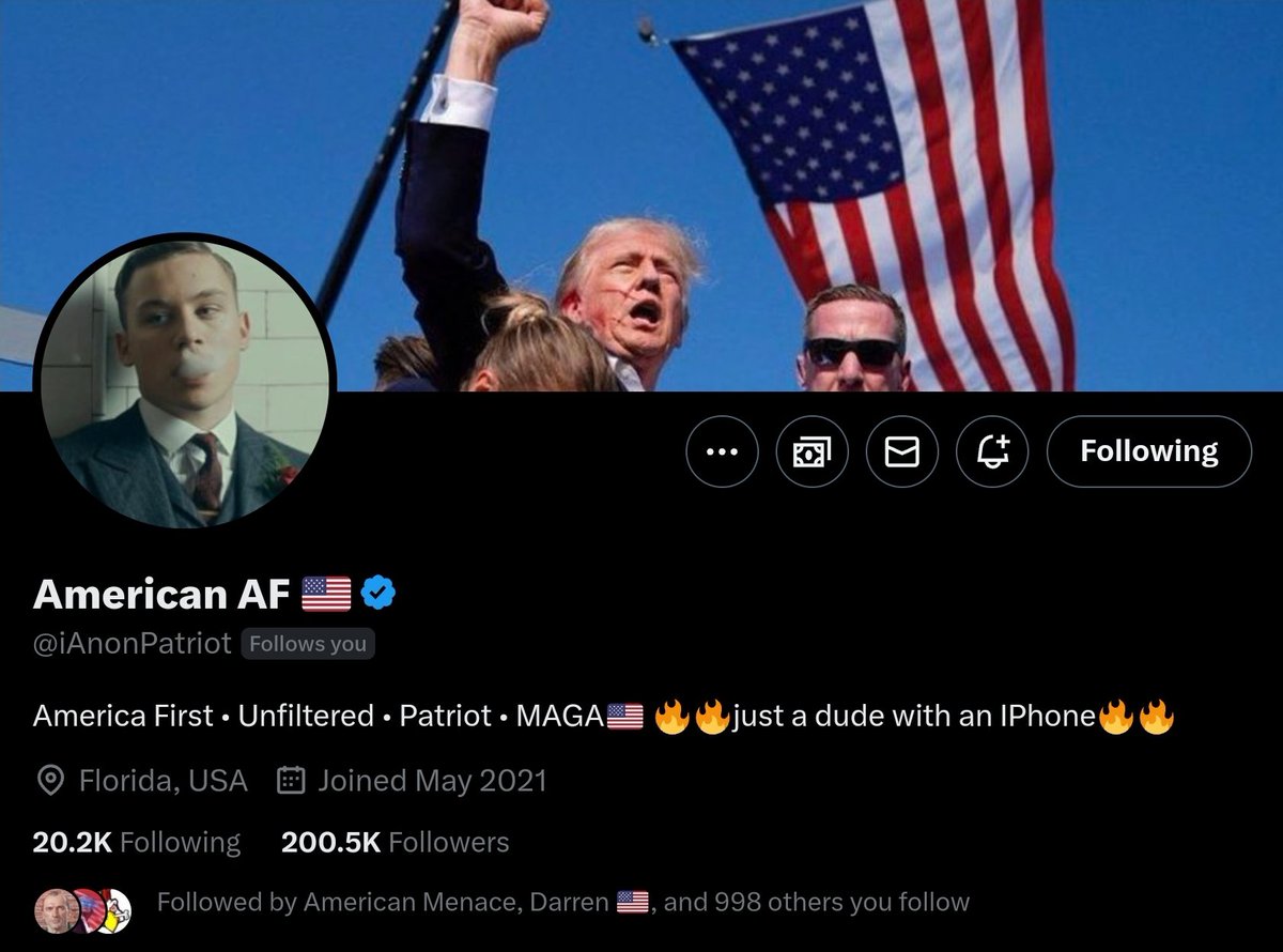 @MdBreathe @MattWallace888 @nicksortor @KimDotcom @OneBadDude_ @MTGrepp America AF (@iAnonPatriot) America First Patriot who is the king of replies. This account engages with his follower base and is a great source of breaking news. Follow him!
