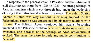 When Palestine went on a strike, 1936, Shaikh Ahmed Al Jaber refused the protests in Kuwait as he thought they were anti-British and provoked pro-Arab nationalism. In a nutshell, he stood against Palestinians and Arabs for the benefit of the Brits in the region.